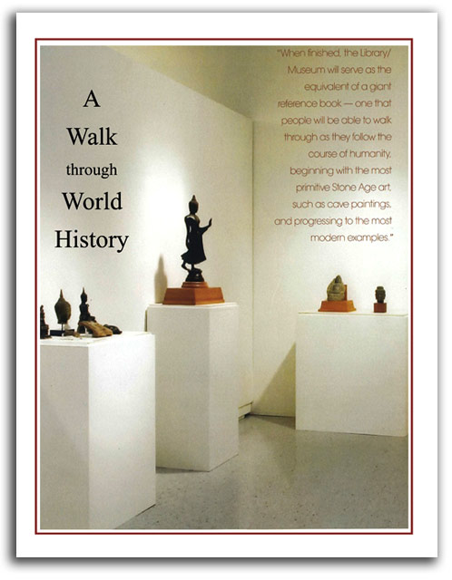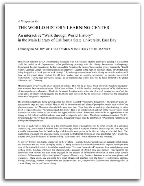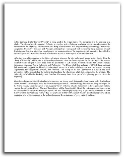WORLD HISTORY LEARNING CENTER, with a detail of the first long wall of the Center, the Science Wall, which starts at the entrance to the Main Library and continues to the Humanities Wing. On this Science Wall will be told "The Story of the Cosmos" by means of a series of panels devoted to Astrophysics, Biology, Geology, etc. At the center of each panel will be not a traditional wall label but an iPad by means of which each visitor can explore that particular subject. After walking through that chapter of World History, one enters "The Story of Humanity" galleries, where there also will be iPads for each cultural area and era from the Stone Age and the Bronze Age to modern times.